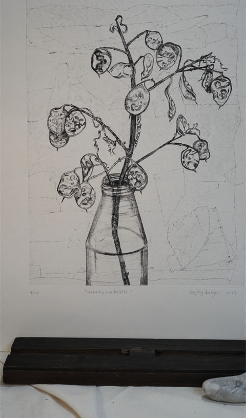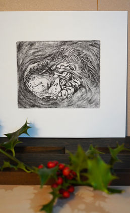 Drypoint is an intaglio printmaking technique which involves incising fine lines into a plate using a sharp point. This process creates a slightly raised edge to the line called a burr. When the plate is inked intaglio and wiped, this burr holds the ink and gives the print a distinctive velvety look. This burr is delicate and repeated printing will flatten it. For this reason, only small editions are produced, stopping before the burr is crushed. I often combine my drypoints with woodcut, linocut, monotype and collagraph plates.