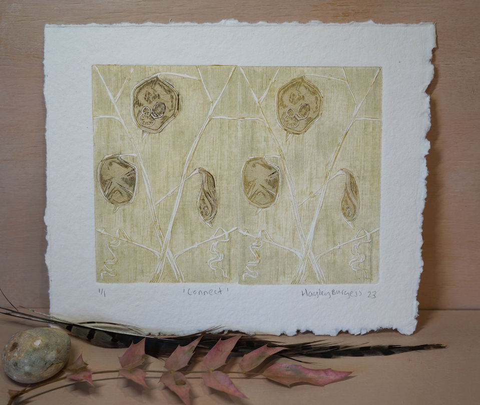 Collagraphy is a very versatile printmaking technique which involves applying textures to a plate that can be printed either intaglio, relief or combination of both. I use offcuts of mountboard for my base and apply paints, recycled papers and reused fabrics to create the plate for printing.