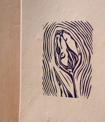 Linocut and Woodcut are relief printmaking process which use high quality steel gouges and V tools to carve away areas of the plate you do not wish to print. What remains is then inked using a roller and printed either by hand or using a press. I prefer to use traditional hessian backed linoleum as it is biodegradable.
